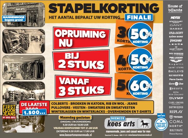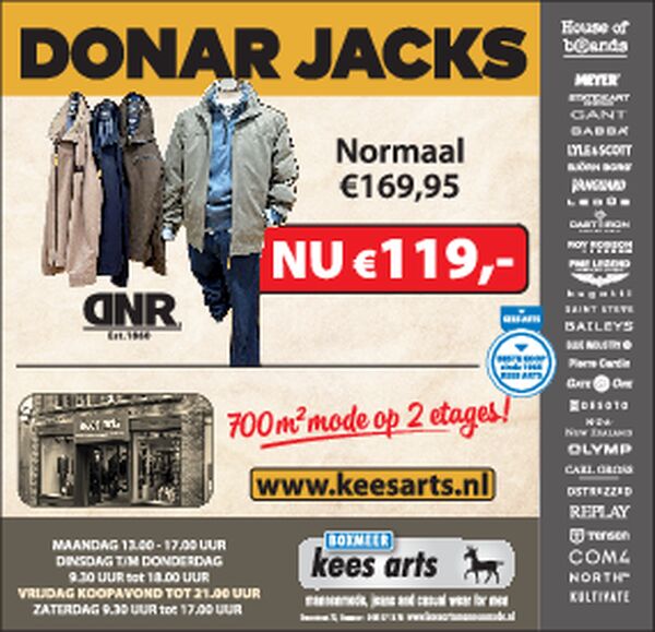 Kees Arts is dé mannenmode-winkel voor Oost-Brabant en Noord-Limburg in hartje Boxmeer. Op maar liefst 700 m² op 2 etages bieden wij u een uitgebreide eigentijdse collectie in mannenmode, vrijetijdskleding en jeans. Vakkundig personeel en een eerlijk advies en kleding met een uitstekende prijs-kwaliteitverhouding is al ruim 60 jaar onze standaard.