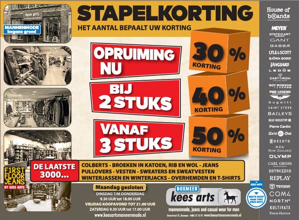 Kees Arts is dé mannenmode-winkel voor Oost-Brabant en Noord-Limburg in hartje Boxmeer. Op maar liefst 700 m² op 2 etages bieden wij u een uitgebreide eigentijdse collectie in mannenmode, vrijetijdskleding en jeans. Vakkundig personeel en een eerlijk advies en kleding met een uitstekende prijs-kwaliteitverhouding is al 60 jaar onze standaard.